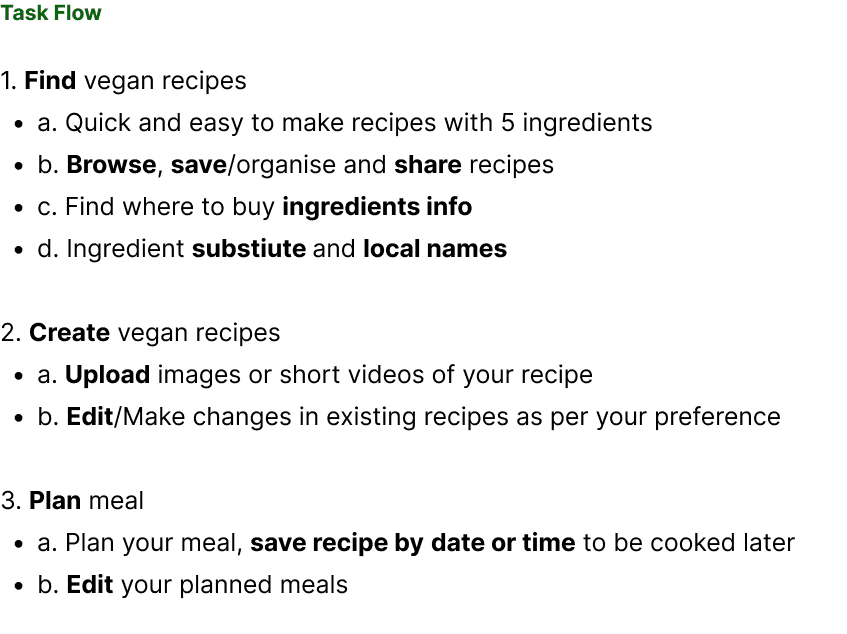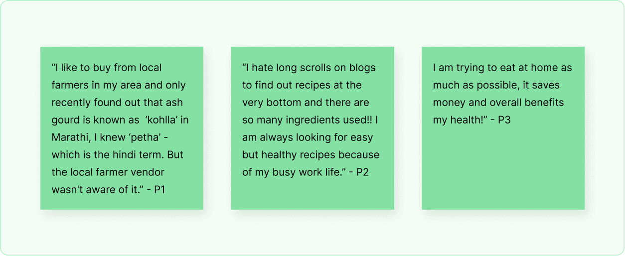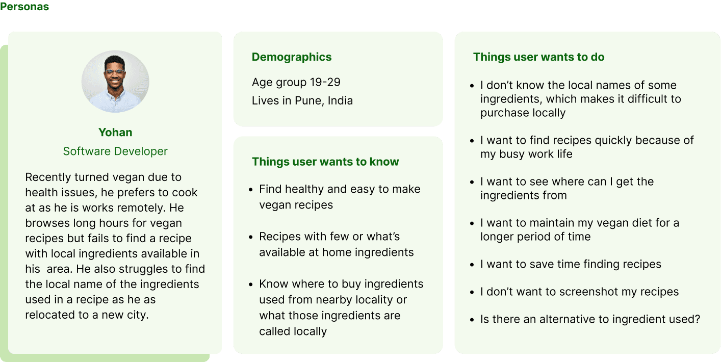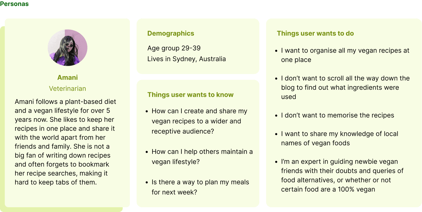 I also conducted a one-on-one user interviews with vegan diet followers as well as people who are trying to adapt the vegan diet. Some of the findings below aided this project in giving the app its solid foundation.